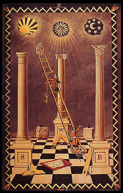 “Az első fokozatban a titkos nevek a Bibliából származó Jákin és Boáz (1Kir 7,21), melyek Salamon templomának két oszlopára utalnak. Az Ótestamentumban gyakran előfordulnak oszlopok, és hol a menynyek kapuját jelölik, hol pedig bizonyos szövetségek, például a Jákob és Lábán között köttetett szövetség emlékeként szolgálnak.”