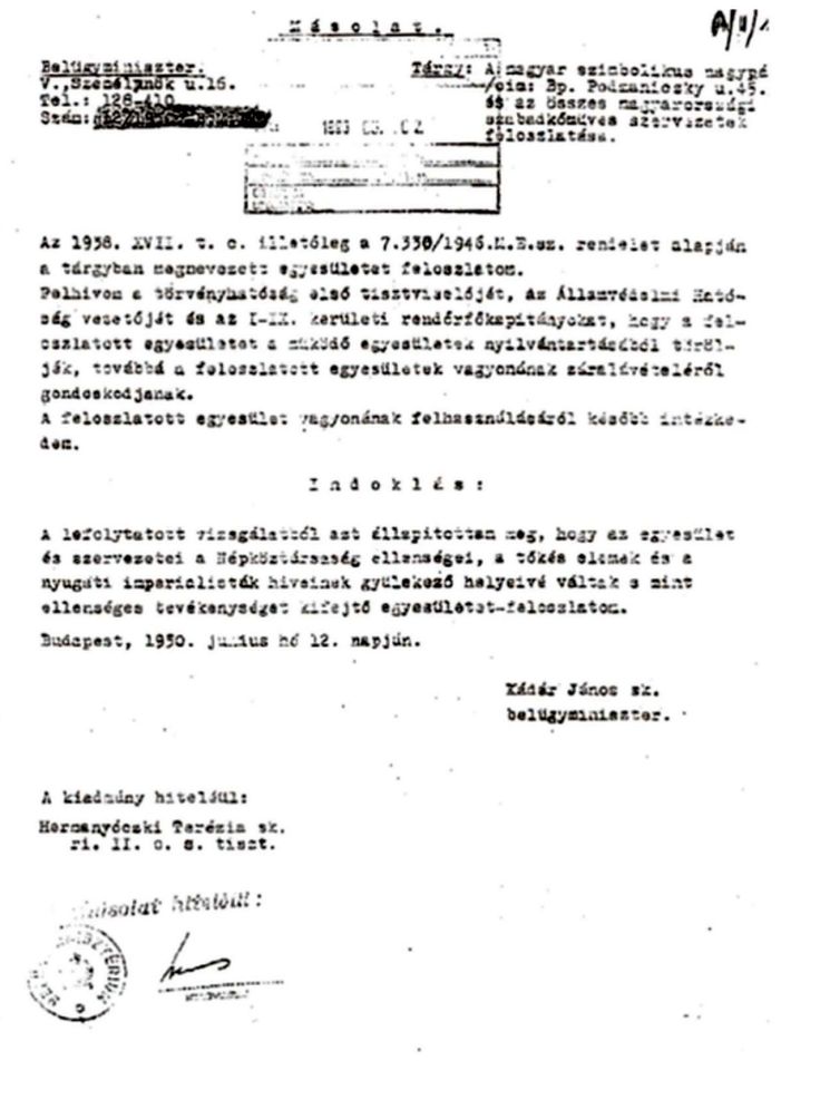 1950. június 12.: Kádár János belügyminiszter rendeletben feloszlatta az összes magyarországi szabadkőműves szervezetet, azzal az indokkal, hogy „a Népköztársaság ellenségei, a nyugati imperialisták híveinek gyülekező helyévé vált”. A rendelet alapján az ÁVH zár alá vette a páholyok vagyonát, és a szervezetet megszüntette.